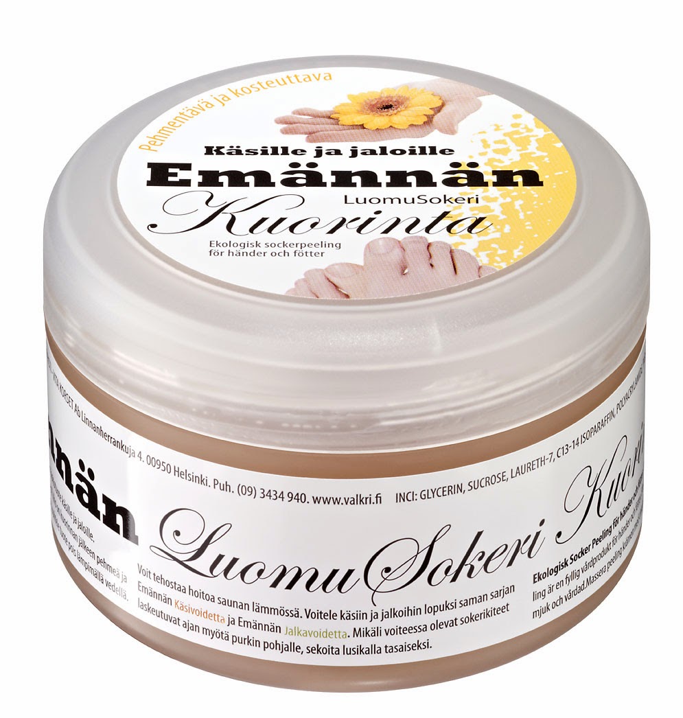 Kuorin käsieni ihoa säännöllisesti ja yksi suosikeistani on Emännän Luomusokerikuorinta. Tämä tuoksuu niin herkulliselta supermakealta karamellilta, että joka käyttökerralla tekisi mieli myös maistaa josko tämä maistuu ihan yhtä ihanalta kuin tuoksuu. Tässä on melko karkearakeinen ja paksu koostumus. Tätä on helppo ottaa purkista sopiva määrä ja kuorintateho on hyvä. Kädet jäävät ihanan pehmeiksi ja tuoksuvat hetken herkkulliselta. Tuoksu ei kuitenkaan ole liian voimakas eikä jää tuoksumaan enää käsivoiteiden läpi. Tämähän on helposti saatavilla ihan marketeissa ja onkin taas yksi kestosuosikeistani.